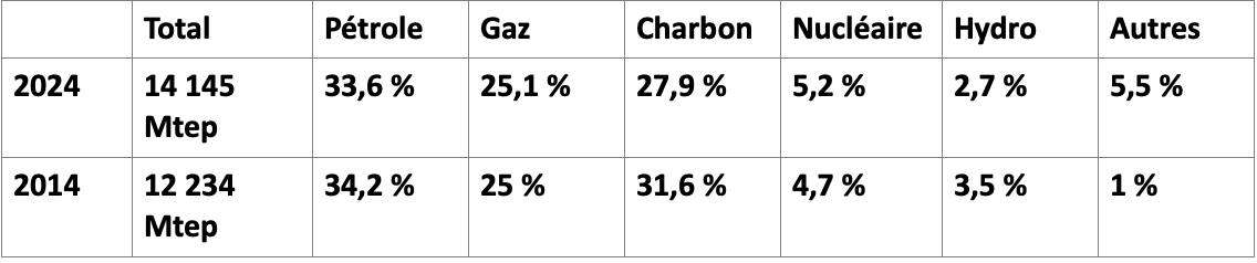 On trouvera des valeurs un peu différentes selon les sources, en fonction des conventions utilisées, et en particulier de l’intégration ou non du bois de chauffe dans les calculs, sans modifier autrement qu’à la marge les conclusions que l’on peut en tirer. Selon la Statistical Review of World Energy, donc sans cette intégration, !es combustibles fossiles se taillent la part du lion, 86,6 % en 2024, et il est remarquable que cette part ait très peu diminuée au cours de ces dix ans, au détriment surtout du charbon (mais celui-ci a cependant augmenté de 2 % en valeur absolue), malgré les énormes efforts consentis pour le développement des énergies autres, essentiellement l’éolien et le solaire photovoltaïque. Nous n’assistons donc pas à une transition énergétique mais à une addition énergétique mondiale.