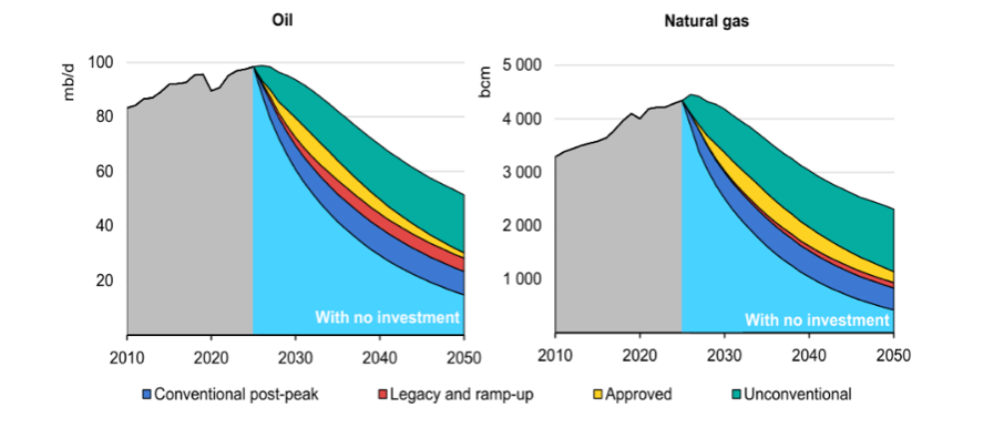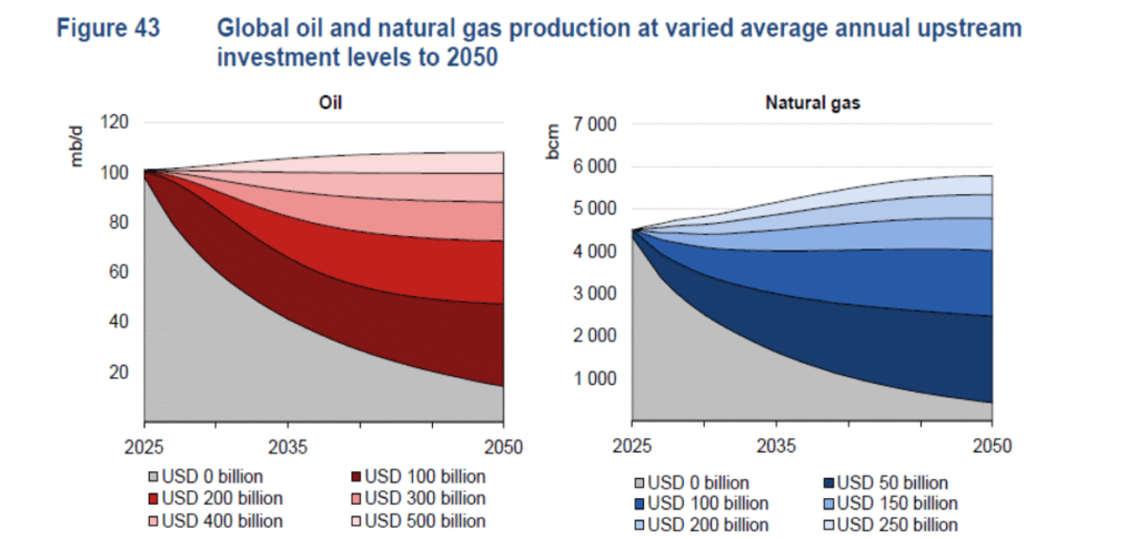 Figure 2 : productions mondiales totales de pétrole (en millions de barils/jour) et de gaz (en milliards de m3) anticipées par l’IEA jusqu’en 2050 en fonction des investissements upstream de la profession.