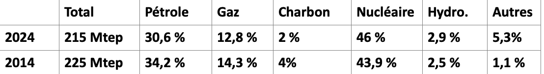 Ci-dessous un tableau (1) représentant la consommation totale d’énergie primaire en millions de tonnes -équivalent- pétrole (Mtep) et pourcentages par source en 2024 et 2014. 1 tep = 41, 868 gigajoules (GJ)= 11,6 MWh.