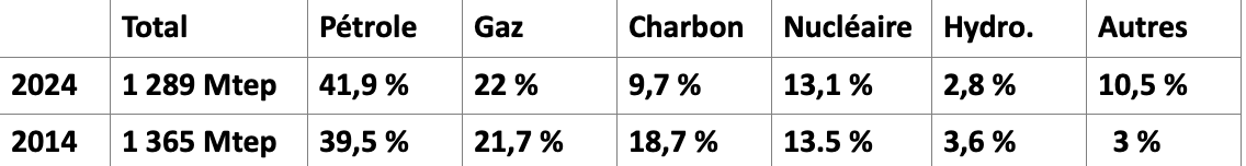 Ci-dessous un tableau (1) représentant la consommation totale d’énergie primaire en millions de tonnes -équivalent- pétrole (Mtep) et pourcentages par source en 2024 et 2014. 1 tep = 41, 868 gigajoules (GJ)= 11,6 MWh.